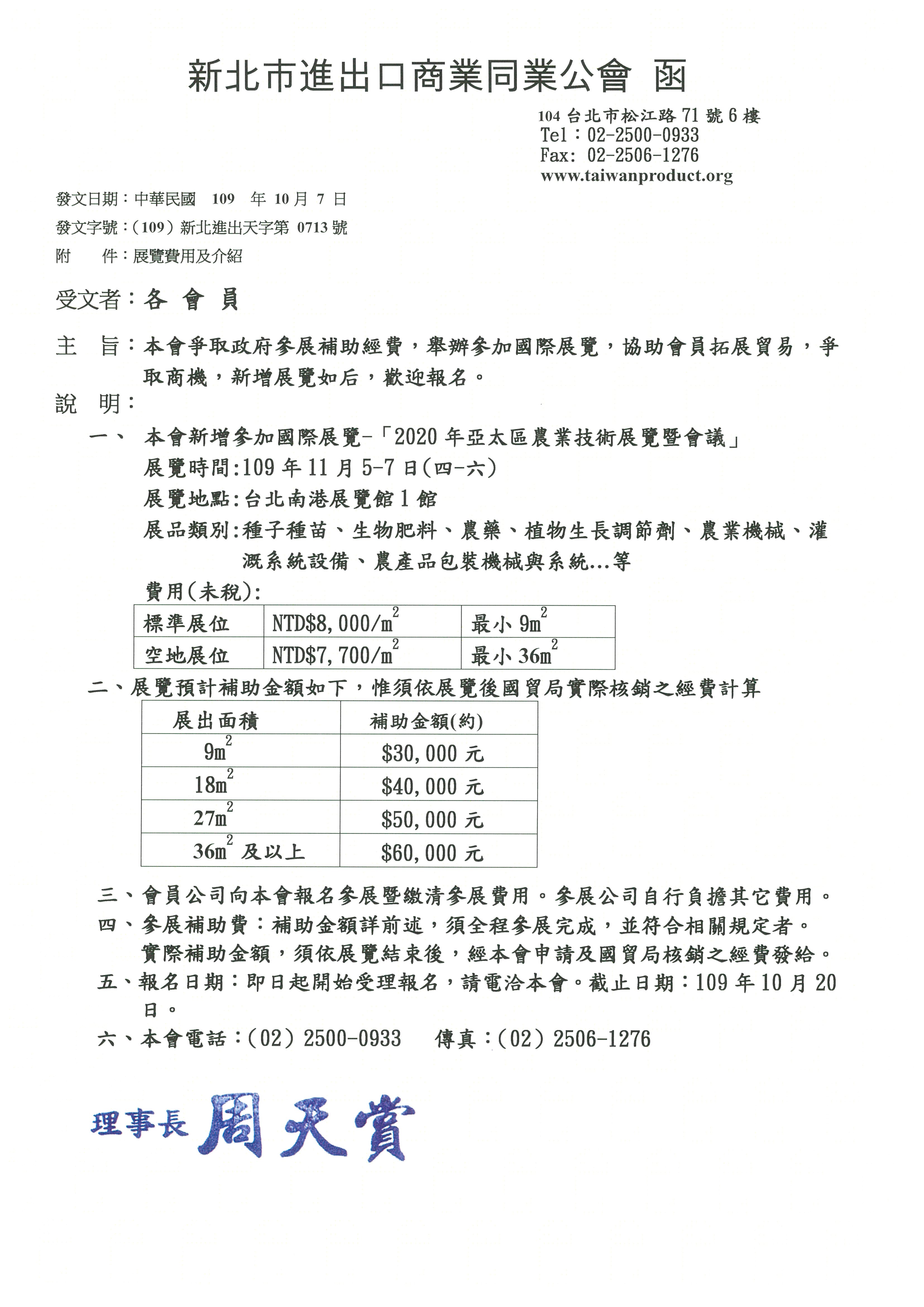 本會新增參加國際展覽--2020年亞太區農業技術展覽暨會議